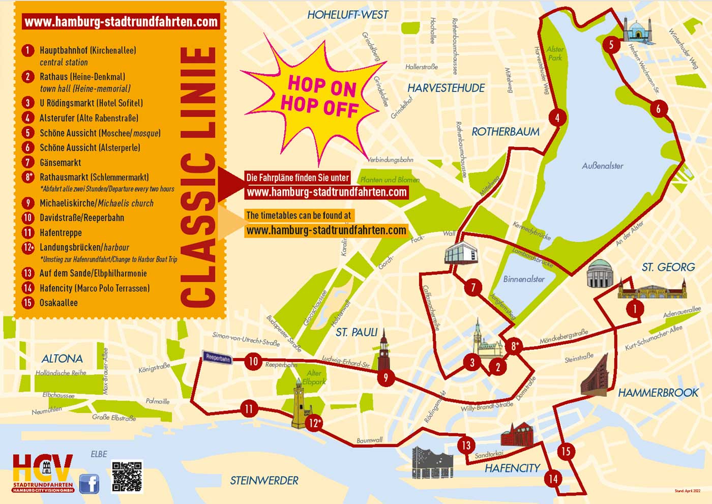 Mit unserem Tagesticket hast Du die Möglichkeit, an 15 ausgewählten Haltestellen ein- und auszusteigen. Gestalte Deinen Tag ganz individuell und erkunde Hamburg in Deinem eigenen Tempo. Unsere Busse verkehren regelmäßig zwischen ca. 10 und 16 Uhr, sodass Du die Stadt flexibel und ohne Zeitdruck entdecken kannst.